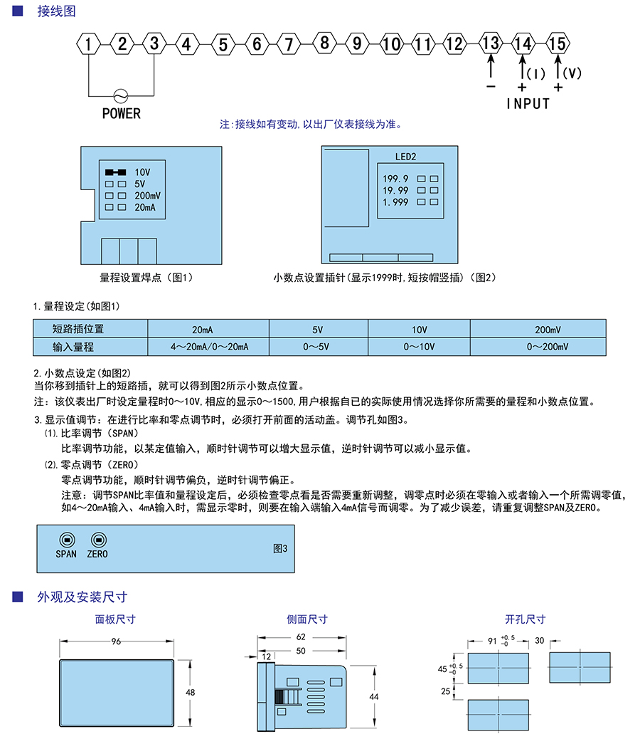 ★ 具有小數(shù)點設定、比率、量程及零點調(diào)整功能。