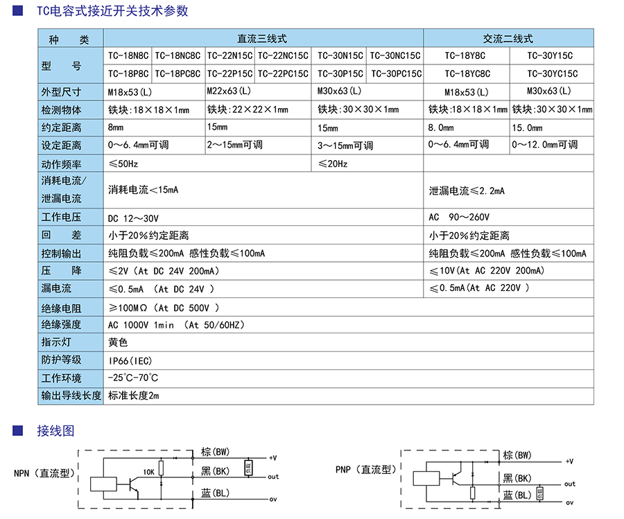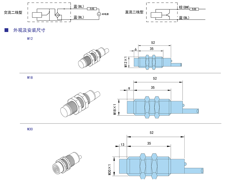 具有三線/二線制、交/直流型、常開/常閉式型號可選