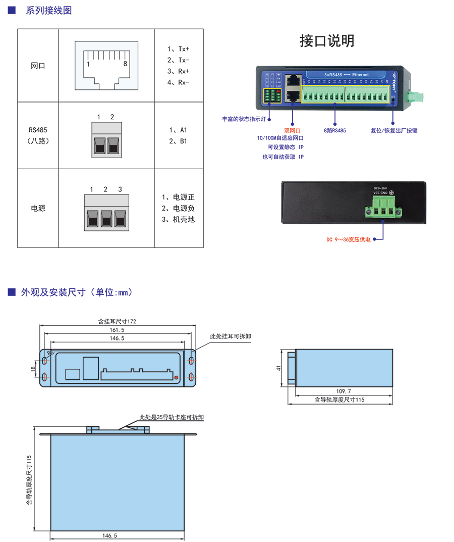雙網口,交換機功能,可以手拉手布線;